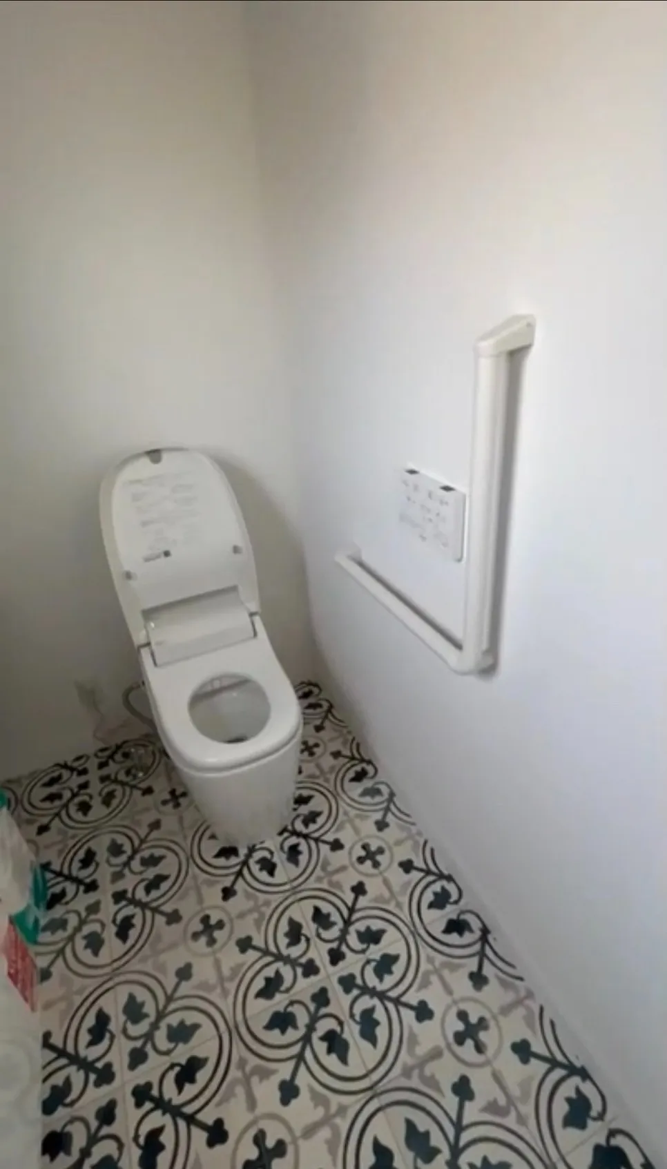 アンティーク調のかわいいクッションフロアが敷かれたお手洗いですが、便座横の壁にはL字型の手すりが付いています。