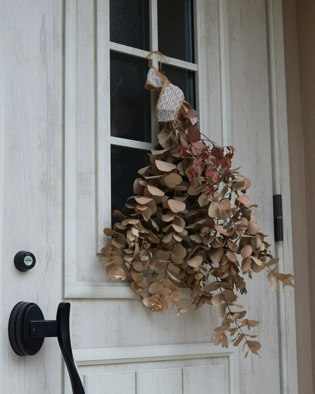 ホワイトの玄関ドアに装飾された秋らしいスワッグ。