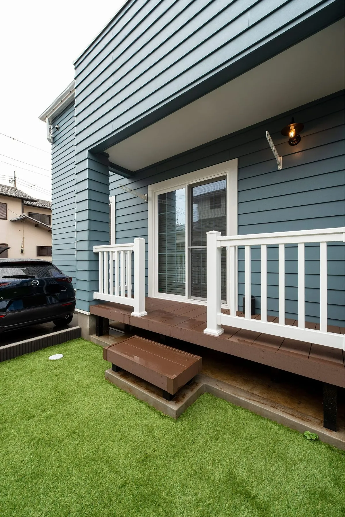 外壁のカラーは、将来のメンテナンス性も考慮し、落ち着いたブルーを採用。